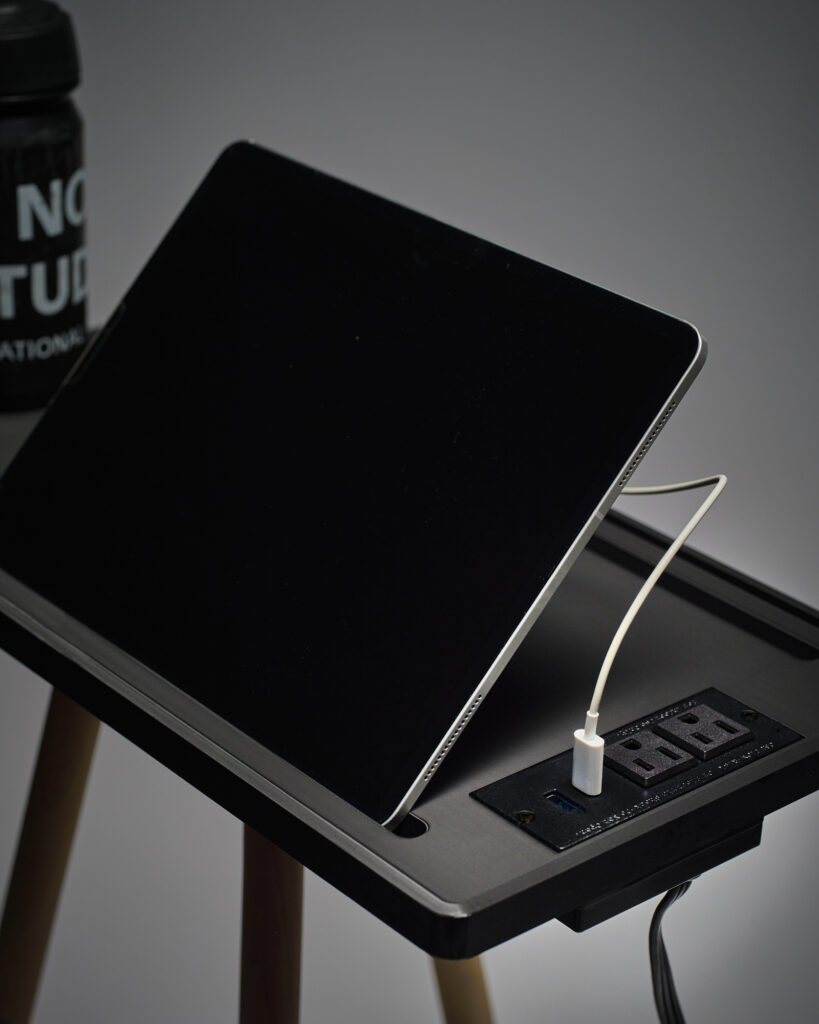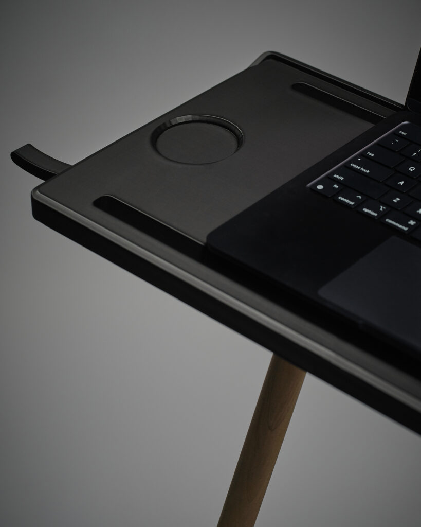 The table is now 22% larger and features a phone holding slot. See below for pics! I also now offer the table with different configurations including a power outlet on the left and no power outlet at all, for a slightly lower cost.