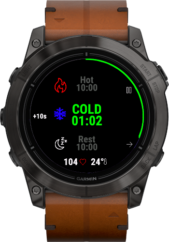 The initial design consists of 3 timers, one for each phase – hot, cold and rest. Each is customisable for your desired duration and level of suffering. The app also tracks the users heart rate, temperature and saves the activity for later review in Garmin Connect.